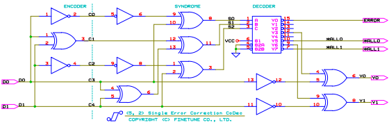 (5,2) 誤り訂正符号のエンコード論理式を式1に、CoDecの回路例を図2に示します。