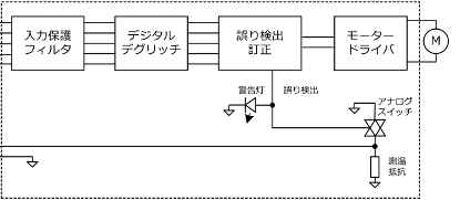 従来のモータードライバインターフェースに、上述のシステムを構成する簡単かつ比較的安価な回路を追加することにより広範囲の異常に対処しうる、より安全なシステムを構成することが出来ます。