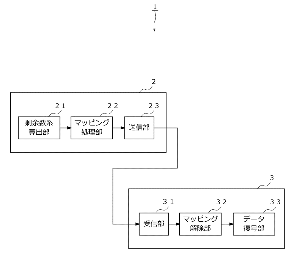▼ 特許明細書より抜粋(クリックで展開します)【発明の名称】データ通信システム、送信装置、および受信装置 【技術分野】 【0001】 本発明は、誤り訂正が可能な通信システムに関する。 【背景技術】 【0002】 データの伝送が文字やバイト単位で行われる通信媒体を用いるデジタルデータ伝送にお いて、デジタルデータを印字可能な文字に変換して伝送するコーデック(符号化/復号) が用いられている(例えば電子メールにおけるMIME BASE64コーデック)。こ のようなコーデックにおいて、デジタルデータに冗長度を付加した誤り訂正符号に変換し 、それを印字可能な文字の組に再変換して送信し、受信した文字の組を誤り訂正符号に変 換して復号し伝送時に文字に生じた誤りの影響を除去することによってデジタルデータを 回復することができる。 【発明の概要】 【発明が解決しようとする課題】 【0003】 しかしながら、上述のようなコーデックでは、誤り訂正符号化と文字化が別々に行われ るため、伝送時に文字に生じる誤りが文字からの変換時に拡大することがある。また、符 号化にも文字化にも冗長度が必要なために符号化率が低く、符号化率を改善しようとする と1つの伝送単位が大きくて伝送処理遅延が大きくなってしまう。また、符号の区切りを 知るための同期ワードや伝送サイズなどの付帯情報を必要としフレーム構造や情報ヘッダ ーなどの特別なしくみが必要である。このようなコーデックは信頼性と実時間性と伝送効 率が同時に要求される分野(例えば産業ロボットや乗り物の制御信号の伝送)には利用困 難であった。 【0004】 上記の課題に鑑み、本発明は、データの伝送単位が比較的小さく、符号の区切りを知る ことが容易で、伝送時の誤りの影響を除去しうる、高符号化率のコーデックが適用された 通信システム、送信装置、および受信装置を提供することを目的とする。 【課題を解決するための手段】 【0005】 上記の従来技術の欠点の本質は、言い換えれば伝送用の文字の持つ情報エントロピーを 全く活用出来ていないことに起因している。そのことに鑑み、本発明では、誤り訂正符号 化と文字化を合わせて行うこと、つまり印字可能な文字種の組み合わせとして実現できる 数の表現方法と、その情報エントロピーが大となる組み合わせを選ぶことで解決する。 【0006】 本発明の実施形態に係るデータ通信システムは、送信装置と受信装置とを備え、送信装 置から受信装置へ、デジタルデータを誤り訂正可能に伝送する。送信装置は、予め定めら れた複数のコプライムで構成されるコプライムセットに基づいて、予め定められた情報ビ ットのビット数を有するデジタルデータについて、コプライムセットを構成するコプライ ムのそれぞれを除数として得られる複数の剰余の組である剰余数系を算出する剰余数系算 出部と、剰余系算出部が算出した剰余数系に含まれる個々の剰余を、予め定められた変換 マップMに基づいて、印刷可能な文字である符号文字に変換することにより、剰余数系を 符号文字により構成される文字列に変換するマッピング処理部と、を備える。受信装置は 、送信装置から受け取った文字列を、変換マップに基づいて逆変換し、剰余数系を復元す るマッピング解除部と、剰余数系算出部で剰余数系を算出するのに用いたものと同じ予め 定められた複数のコプライムとマッピング解除部が復元した剰余数系とに基づいて、デジ タルデータを復号するデータ復号部とを備える。コプライムセットは、n+r(ただしr ≧1)個のコプライムにより構成され、情報ビットのビット数で表されるデジタルデータ を、コプライムセットを構成するコプライムのうち下位n個のコプライムによる剰余の組 により一意に表すことができるように定められる。 【0007】 本発明では、コプライムセットを構成するコプライムのうち下位n個のコプライムによ る情報エントロピーの整数部分を情報ビットの伝送に利用し、小数部分に相当する余剰分 を主情報以外の情報の伝送に利用するとよい。 【0008】 本発明では、送信装置から受信装置に、予め定められた符号語間の分離用のデリミタ文 字を伝送可能に構成され、変換マップは、デリミタ文字の1ビット誤りになる文字を符号 文字に用いないようにするとよい。 【0009】 本発明の実施形態に係る送信装置は、予め定められた複数のコプライムで構成されるコ プライムセットに基づいて、予め定められた情報ビットのビット数を有するデジタルデー タについて、コプライムセットを構成するコプライムのそれぞれを除数として得られる複 数の剰余(以下、シンボルと呼ぶ場合がある)の組である剰余数系を算出する剰余数系算 出部と、剰余系算出部が算出した剰余数系に含まれる個々の剰余を、予め定められた変換 マップMに基づいて、印刷可能な文字である符号文字に変換することにより、剰余数系を 符号文字により構成される文字列に変換するマッピング処理