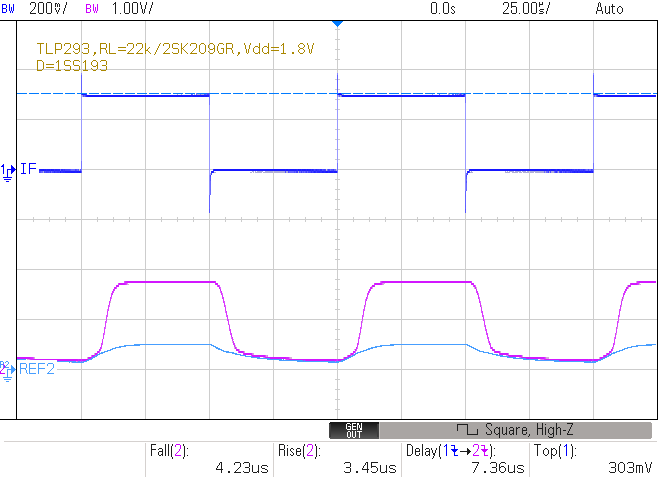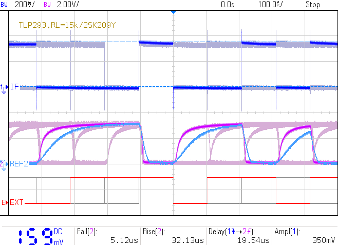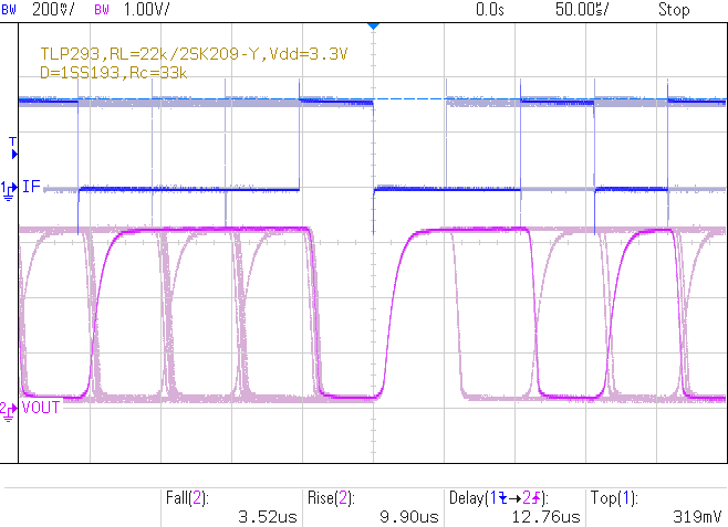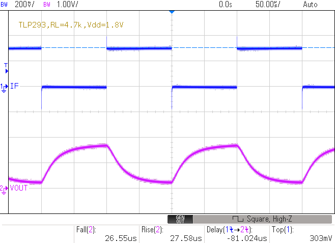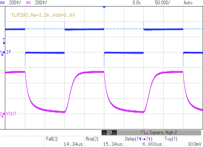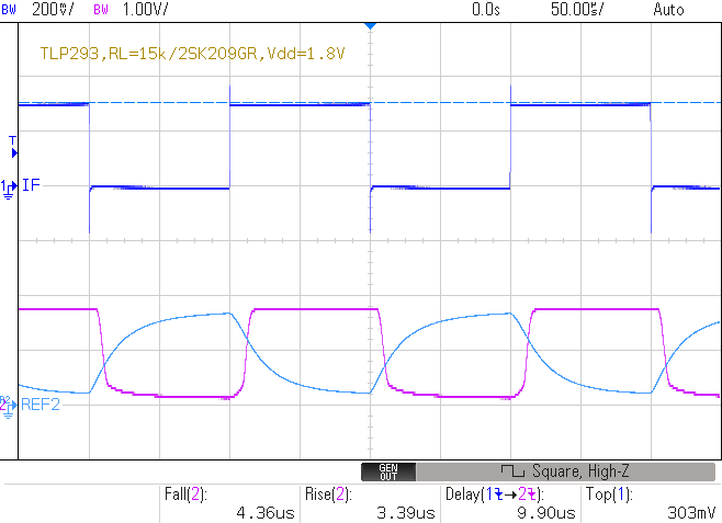 tf=26.55us, tr=27.58us, (td=18.976us)fig.3 単純プルアップでの過渡応答特性例 fig.4 フォトカプラの単純プルアップの回路例 (RL=15kΩ)