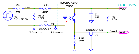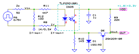 このアナログスイッチとして、カットオフ電圧が -0.3V 前後と小さく、かつドレイン遮断電流がプルアップ抵抗と電源電圧で決まる電流に対して十分大きな、ディプリーション・モードのFETを使用すれば、特段の制御回路を設けることなくフォトトランジスタのコレクタ出力をコレクタ出力がオンからオフに立ち上がり始めた時点で切り離すことができかつ、LVCMOSのような低電圧ロジックICにもそのまま接続することが出来る。この手段を使用した構成例を fig.8 に示す。以降簡便のため、この構成例をLSC(Low cut-off voltage Switch Cascode)と称す。 併せてフォトトランジスタのコレクタ電圧はコレクタ電流にかかわらずカットオフ電圧から0Vの範囲になるため、フォトトランジスタのコレクタから見て低抵抗となり、フォトトランジスタが飽和状態からの回復時には、カスコード接続と同様にミラー容量の低減効果が得られる。