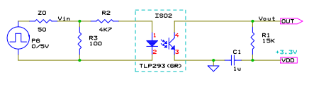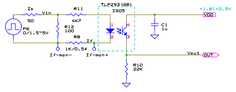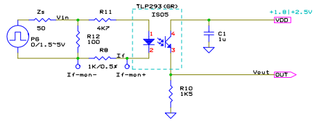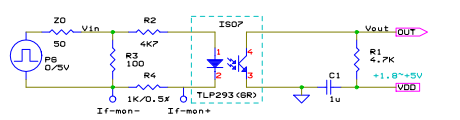 フォトカプラでは動作電流と伝送レートはトレードオフの関係にあり、単純プルアップでは低消費電流と高速動作は両立できない。 所望の伝送レートを得ようとすれば動作電流を増やす必用がある。 単純プルアップでの実例を下に示す。 TLP293 は汎用フォトカプラの一例として使用したもので、東芝のフォトトランジスタ出力型の汎用フォトカプラである。これは低入力電流を特徴としている。