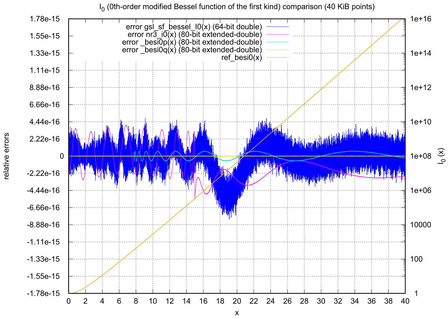 Maximum errors in the calculations shown above. (0 ≤ x ≤ 40.0) gsl_sf_bessel_I0 : 8.182e-16 (x = 19.0859375) nr3_i0 : 5.534e-16 (x = 15.0009765625) _besi0p : 6.353e-17 (x = 33.8134765625) _besi0q : 2.494e-18 (x = 38.1123046875)Note. gsl_sf_bessel_I0(x) overflows when x > 708.78271289338391628L.