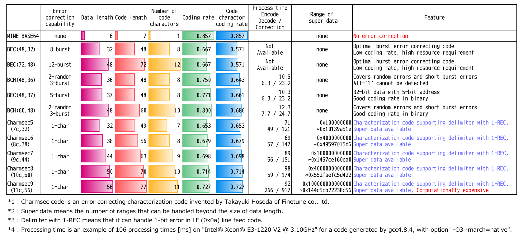 The Charmsec code is an error-correcting code invented by the author and is a block code that encodes data into printable characters.
