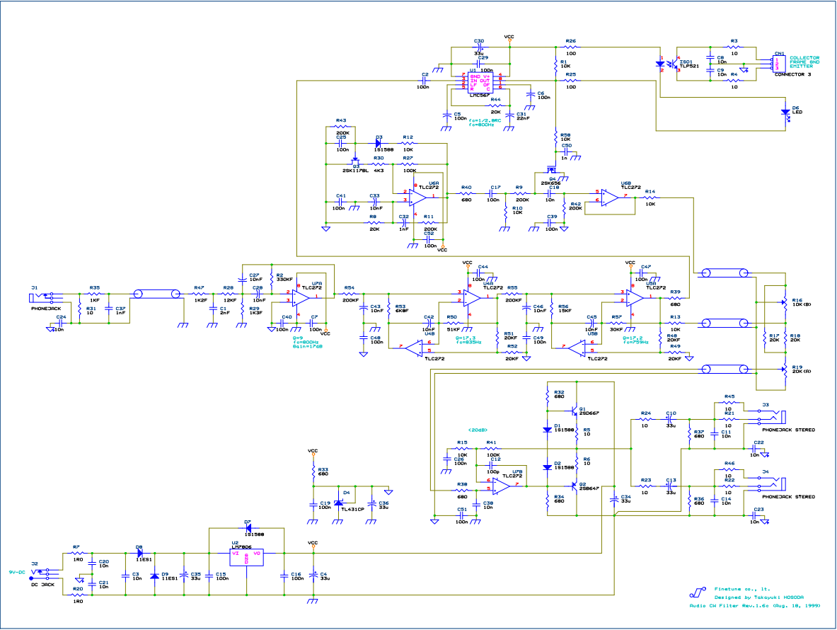 R38, C51 は RFI 防止用 LPF です。 U7B, R41, R15, R26 と出力バッファ用トランジスタ Q1, Q1 で出力アンプを形成しています。 増幅度を、R41, R15, C26 で決定し、R15, C26 で約160Hz にポールを持たせ低域での増幅度を1に下げています。 C26 は直流カットも兼ねています。C12 は位相補償コンデンサです。 Q1, Q2 でコンプリメンタリプッシュプル型電流アンプを構成しています。 R32, D1, R5, R34, D2, R6 はバイアス回路で、Q1, Q1 をAB級にバイアスしています。 C34 は電源のデカップリングコンデンサです。 R24, R23 は出力分配抵抗兼出力保護抵抗です。