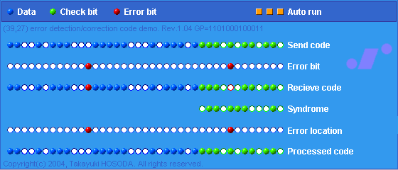 この (39, 27) 符号は 2 ビットまでのランダム誤りの訂正と 3 ビットのランダム誤りを検出することが出来ます。