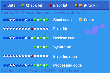 左から 1-bit 誤り訂正、2-bit 誤り検出のテストになっています。- Control 部分をクリックすると制御用コードを送出します。