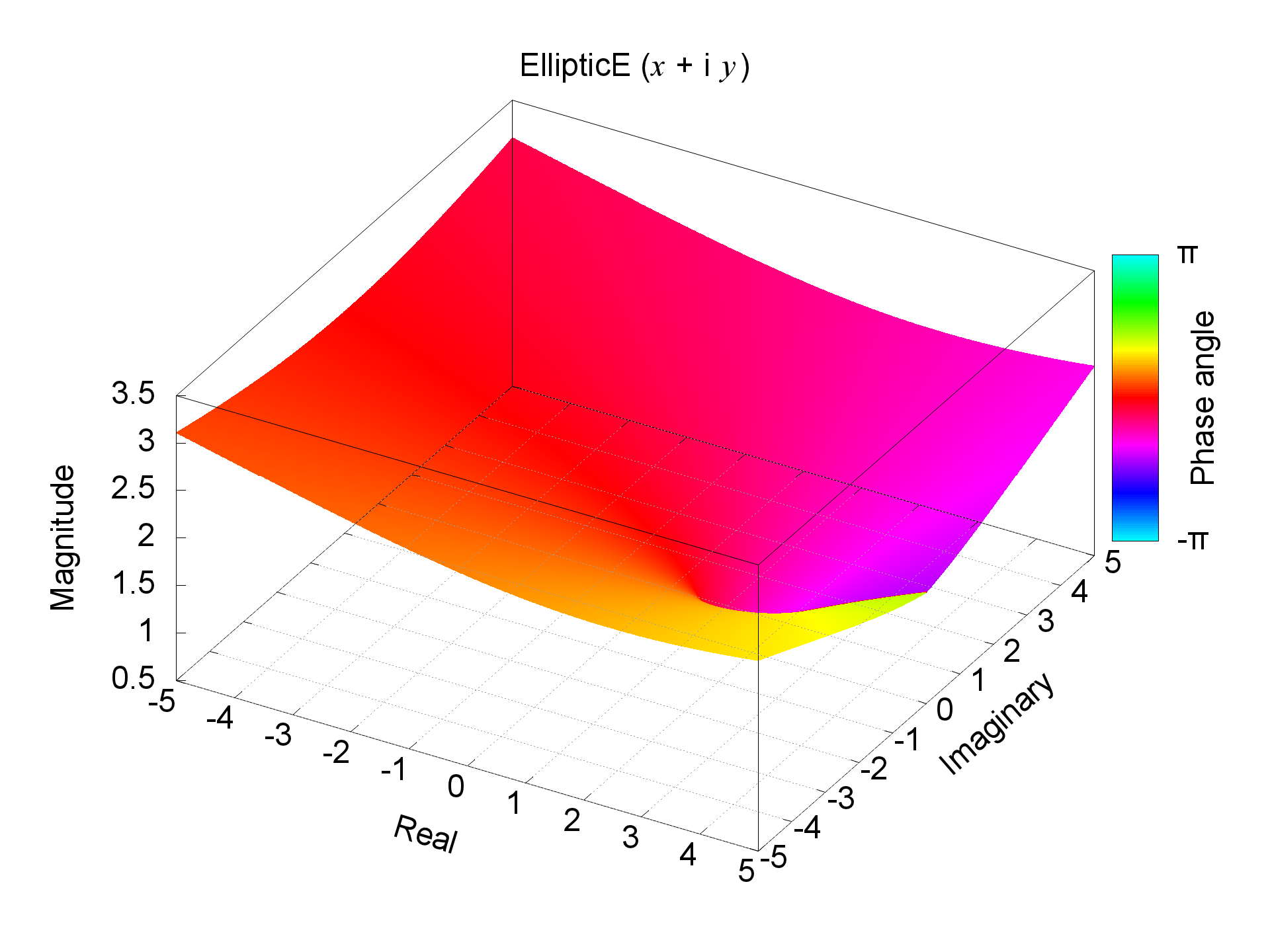 E(0) ~= 1.570796326794896619 E(0.25) ~= 1.467462209339427155 E(0.5) ~= 1.350643881047675503 E(0.99) ~= 1.015993545025223936 E(1) ~= 1 E(-1) ~= 1.910098894513856009 E(2) ~= 0.599070117367796104 + 0.599070117367796104i E(0.25 +0.25i) ~= 1.473879994036592246 - 0.108279607993355404i E(1 + i) ~= 1.283840957898244583 - 0.531784336691518627i E(-1 + i) ~= 1.938813920750761868 - 0.293462148355703310i