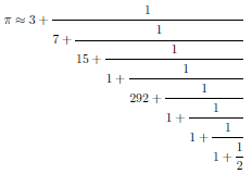 Note: Simple continued fraction expression of π, to 12 digits accuracy.