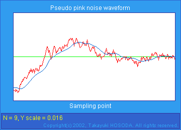 fig.5 は、「1/f雑音生成アルゴリズム」で紹介している アルゴリズムで生成したピンクノイズと、それに 2次 IIR LPF をかけた波形を表示している。