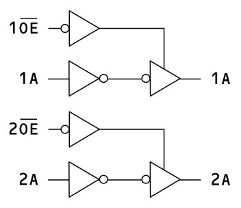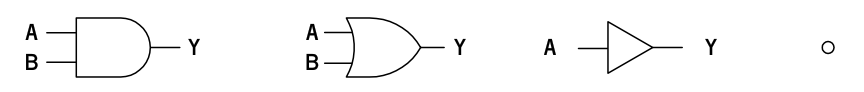 これは、左から AND (論理積)、OR (論理和)、BUF (緩衝増幅器)、NEG(logic negation, 負論理表示子) となっています。