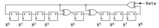 生成多項式 x8 + x5 + x4 + 1 での除算回路例Data の入力が終わったときのレジスタの内容が剰余となり、これを CRC とします。