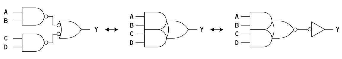 TTL では積和のために AND-OR-INV ゲートが使われていましたが、CMOS 論理 IC の中や、大規模プログラマブル論理デバイスでは、 NAND-NAND ゲートによって構成される AND-OR を利用して大規模な論理を合成することが行われています。