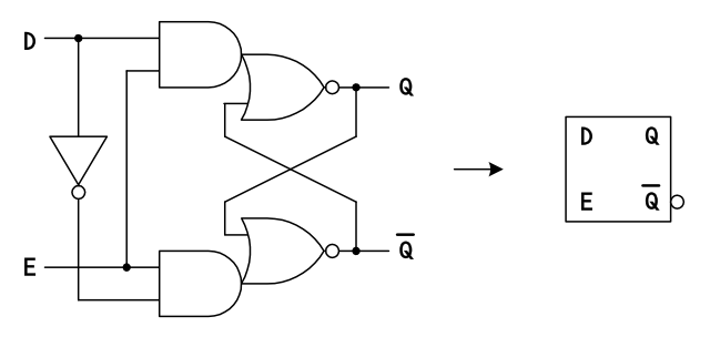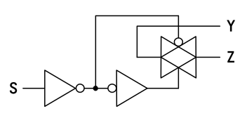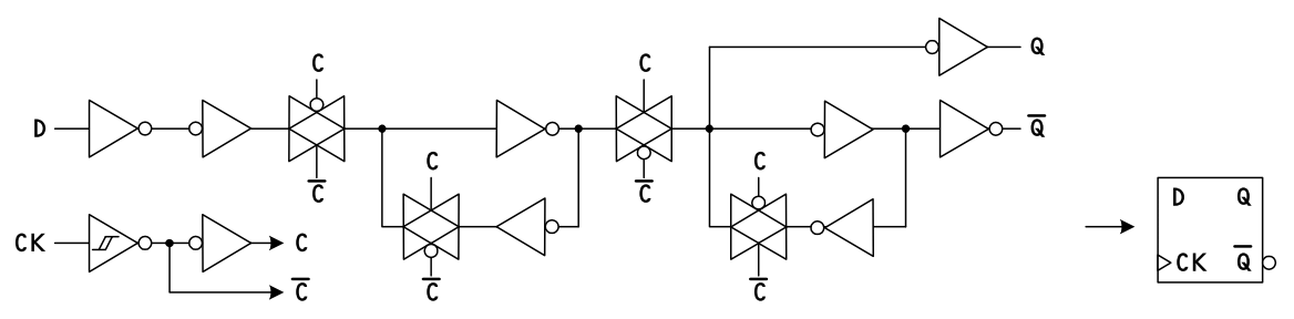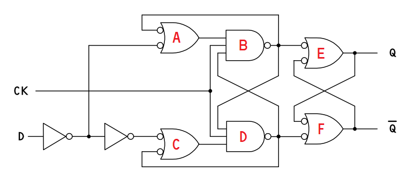 まとめると、クロックが 'L' のときには 出力フリップフロップ SR-FF(E, F) がデータを保持し、 クロックの 'L'→'H' の変化で 入力フリップフロップ SR-FF(A, B) または SR-FF(C, D) がデータを 取り込み、保持していると言えます。CMOS ロジック IC ならではの回路構成で、ラッチの構成用にバイラテラル・スイッチが活用されているものもあります。 (e.g. 74LVC1G79)