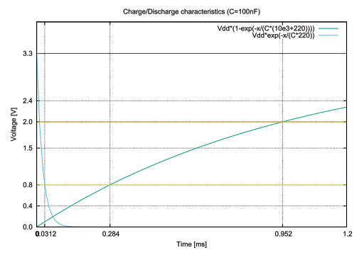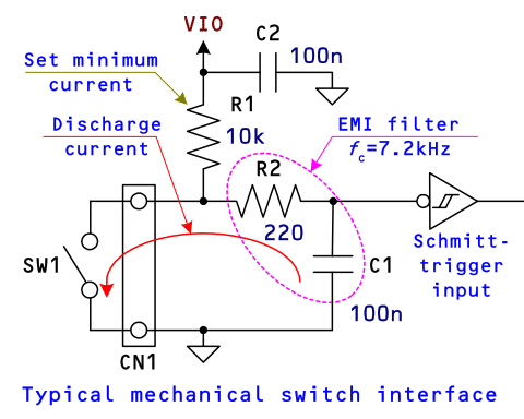 スイッチ・インターフェース部の補足ですが、R2, C1 で EMI フィルタを構成し、中波から UHF の EMI や 静電気の放電(ESD, Electro Static Discharge)の影響を低減します。ここで、R2の値はスイッチ Sw がオンになったときに C1 の放電電流 がスイッチの定格電流を超えないようにR2の値を設定してします。 小信号スイッチの最大電流は 50 mA 程度のものが多いため VIO が 3.3 V として ISw(max) = 3.3 / 220 = 15 mA としています。