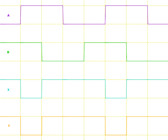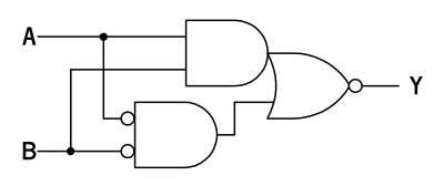 Y = !((!!(A # B) & !A) #(!!(A # B) & !B)) = !((A & !A) #(B & !A) #(A & !B) #(B & !B)) = (!A & !B) #( A & B)これは XOR の出力を反転したものとなっていて XNOR と呼ばれることがあります。 A と B が一致したときに Y が 1 となります。