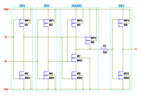 ≡DTL や入力の AND 用のダイオードをマルチエミッタ・トランジスタに置き換えた TTL (トランジタ・トランジスタ・ロジック) あるいはトランジスタを非飽和で動作させる ECL (エミッタ・カップルド・ロジック)も21世紀には前世紀の遺物となり、 論理素子は高速な Low Voltage CMOS ロジックが全盛です。 CMOS は N-チャネル の MOS-FET の方がオン抵抗などの性能が良いので、N-MOS の方を重ね、 P-MOS の方を並列にして基本論理素子として NAND ゲートを構成します。 CMOS 1段での増幅度は小さいため、通常入力や出力に3段程度の INV が反転増幅器として入れられます。