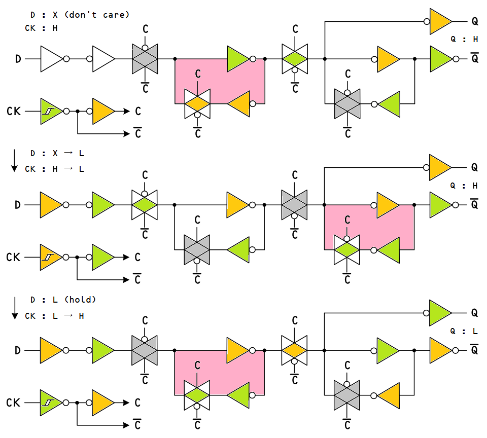 - ピンク色の箇所は帰還ループが閉じていてデータを保持していることを表します。すなわちトランスパレント・ラッチとして働いています。