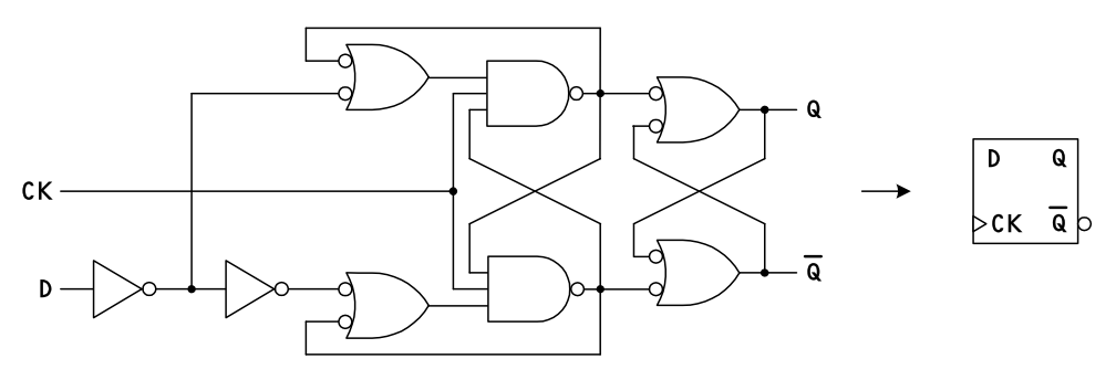 - クロックが H → L のに変わると、右側のセカンダリ・ラッチ (secondary latch) にデータが保持されて、それが出力されます。
