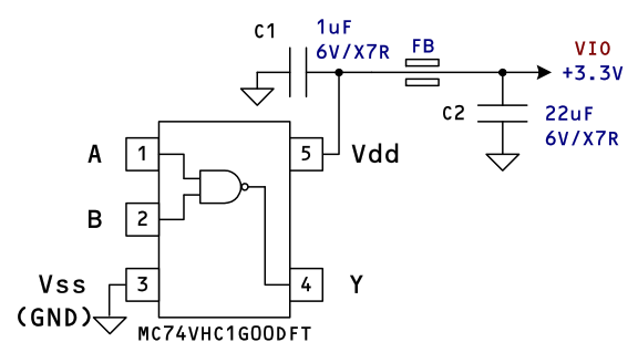 ⚠️実際のロジック IC には電源の供給はもちろん、電源ピンの近傍にデカップリングキャパシタが必要です。