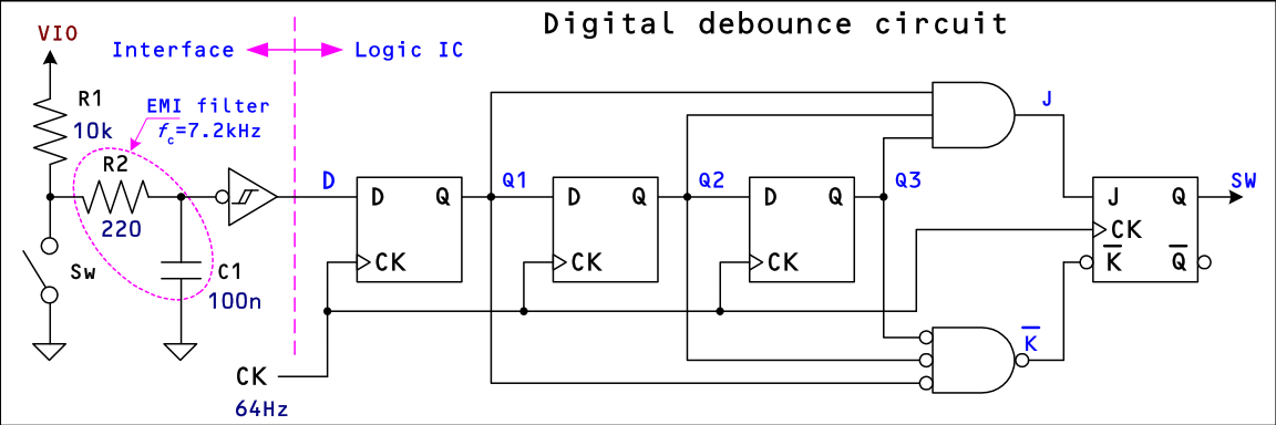 この回路では、外部スイッチの信号を EMI フィルタで高周波や静電気の影響を低減した後、 フィルタでなまった波形をシュミット・トリガー・インバーター (e.g. 74HC14) で波形整形しつつ正論理に変換して デジタル・デバウンス回路に入力しています。