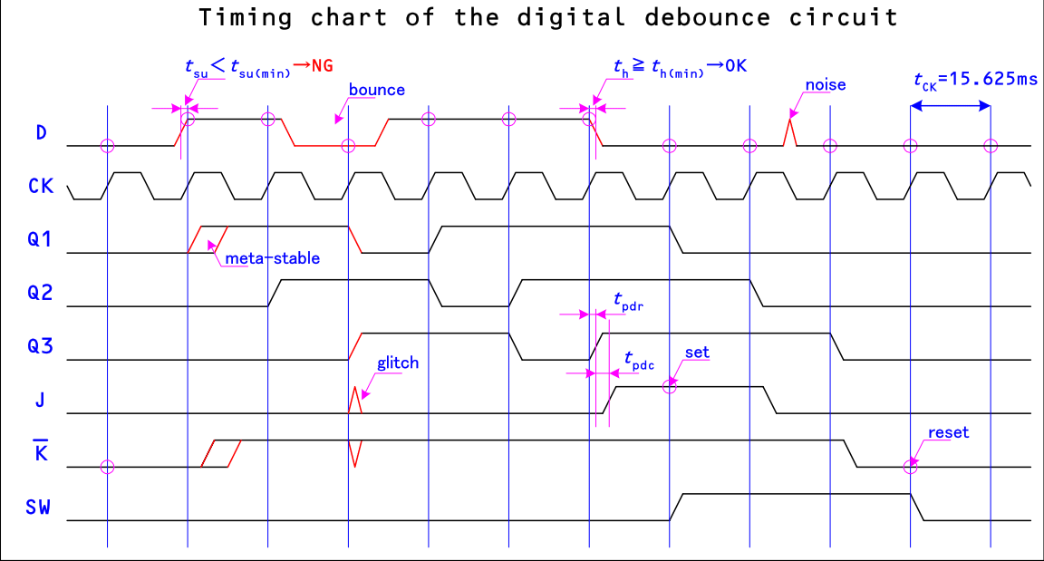 デジタル・デバウンス回路では、外部からの信号 D をただ1つの D-FF で受け取り、 それを直列接続のもう2つの D-FF に入力します。この3つの D-FF の出力が全て 1 になったとき、 すなわち、クロックの3回分の時間連続して入力として 1 がサンプリングされたとき、 次のクロックでに次段の JK-FF がセットされます。 同様に3回連続して 0 がサンプリングされたときに JK-FF はリセットされます。