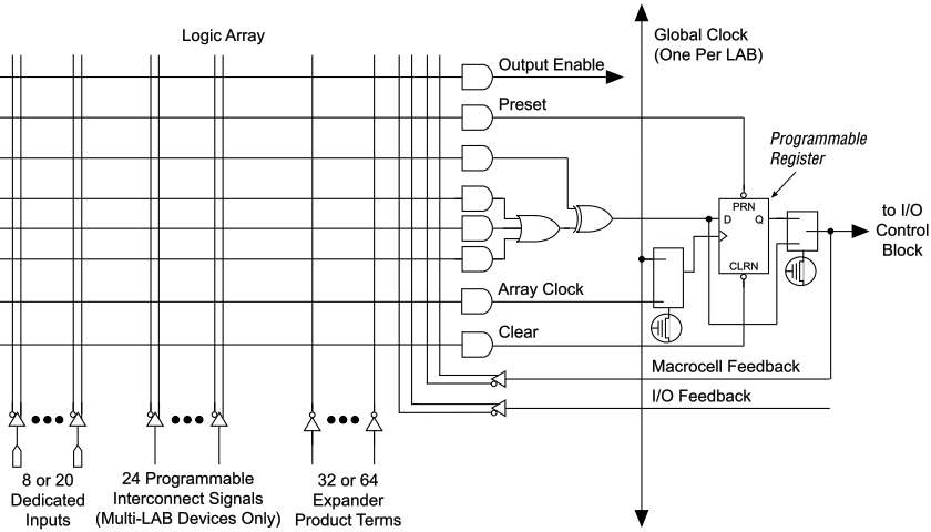 これまでに述べたロジックまとめてユーザーでプログラム可能にしたデバイスとして、 CPLD (Complex Plogrammable Logic Device) や FPGA (Field Programmable Gate Array) が作られています。 下の図はやや古典的な Altera(現 Intel) の CPLD のマクロセルの例です。 マクロセルとは1つの出力を構成することのできるプログラマブルな論理セルのことです。 このようなデバイスをプログラムするために、HDL(ハードウェア記述言語)が用いられています。
