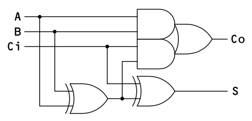 これを2つ組み合わせるとキャリー入力を備えた全加算器ができます。これは数値演算の基本となります。全加算器