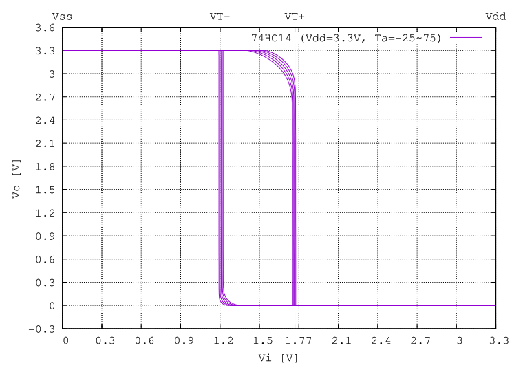 同様に出力電圧は電源電圧が 3.0V , 負荷電流が 4 mA 以内で、H のとき 2.34 V 以上、L のとき 0.52 V となります。