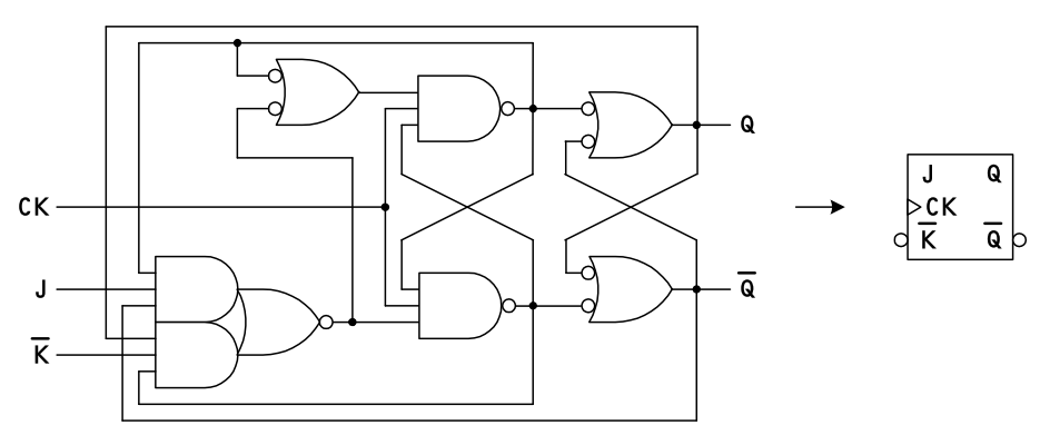 SR-FF を使いやすくするために、クロックに同期して J でセット、K でリセットできるようにしたものが JK-FF です。