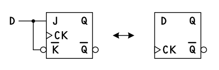 また、J, K にコンプリメンタリな入力データを与えるとその動作は、D-FF と同じになります。