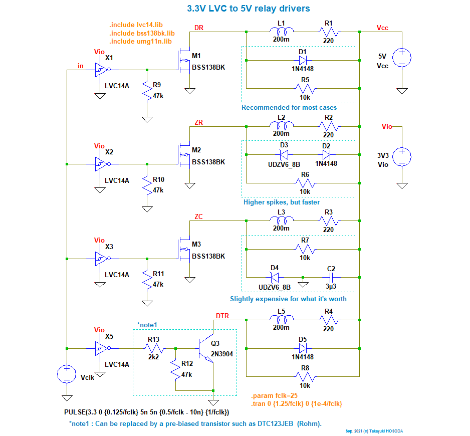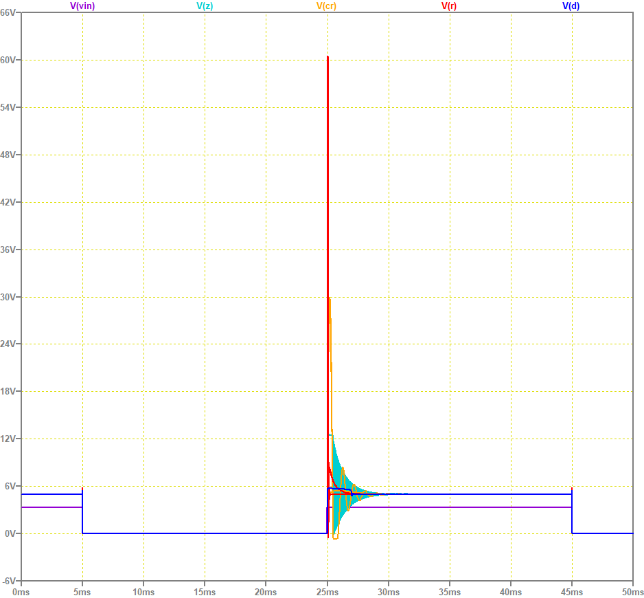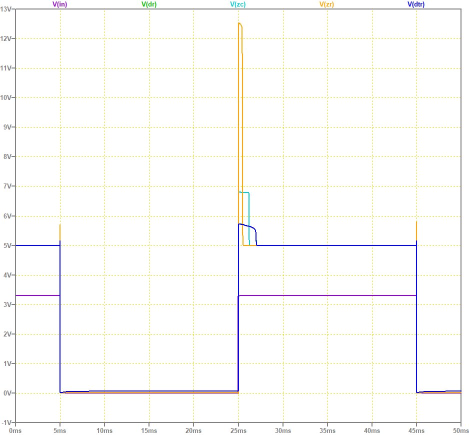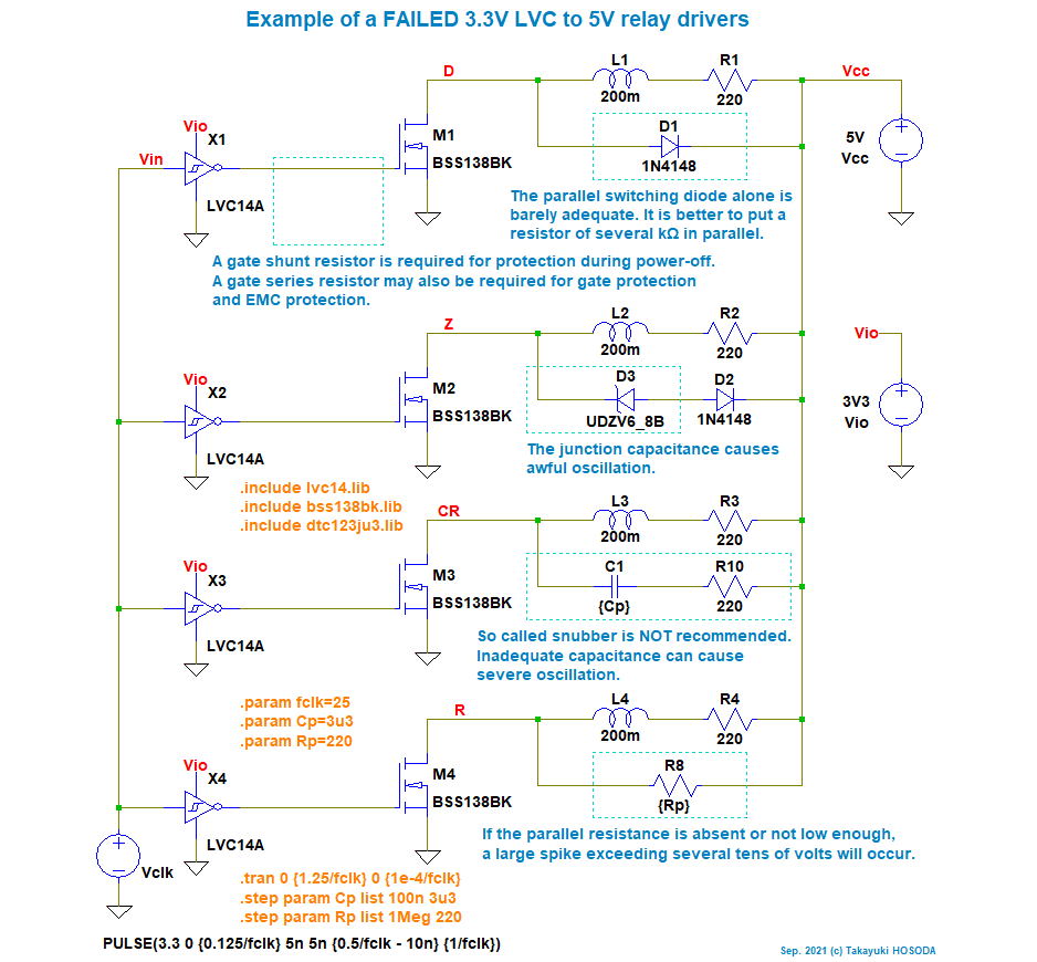 M2 の出力 Z では、M2 がオンの間に L2 にエネルギーが蓄えられますが、 M2 がオフになったときにこのエネルギーの一部は D3, D2 で消費されますが、 D3 がオフになったときに D3 の接合容量と L2 で周波数の高い振動を引き起こす恐れがあります。 これは、電子部品の故障や雑音の原因となります。![]()