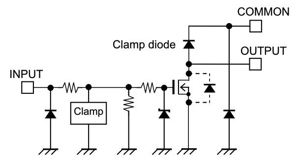 従来品の出力素子のダーリントントランジスタは電流駆動素子であるため、特に大電流時に低めの出力飽和電圧を得るためには、 比較的大きな入力電流が必要となり、3.3 V 系のロジック IC では入力電流不足となって不適合となる場合がありました。 TBD62083Aでの出力素子の DMOS FETは電圧駆動素子であるため、入力電流が約 0.1 mA と少なくて済み、3.3 V 系のロジックICに適合します。 総出力電流が問題となる多ピンの LSI 等への直接接続にも適し,また EMC 対策的にも有利となります。出力電圧
