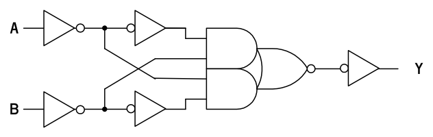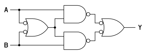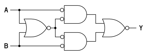 この構成は、B が 1 のとき !A を、B が 0 のときに A を選ぶセレクタであると解釈することもできます。