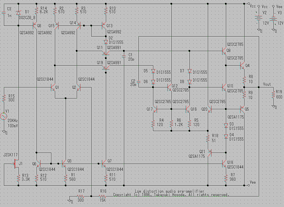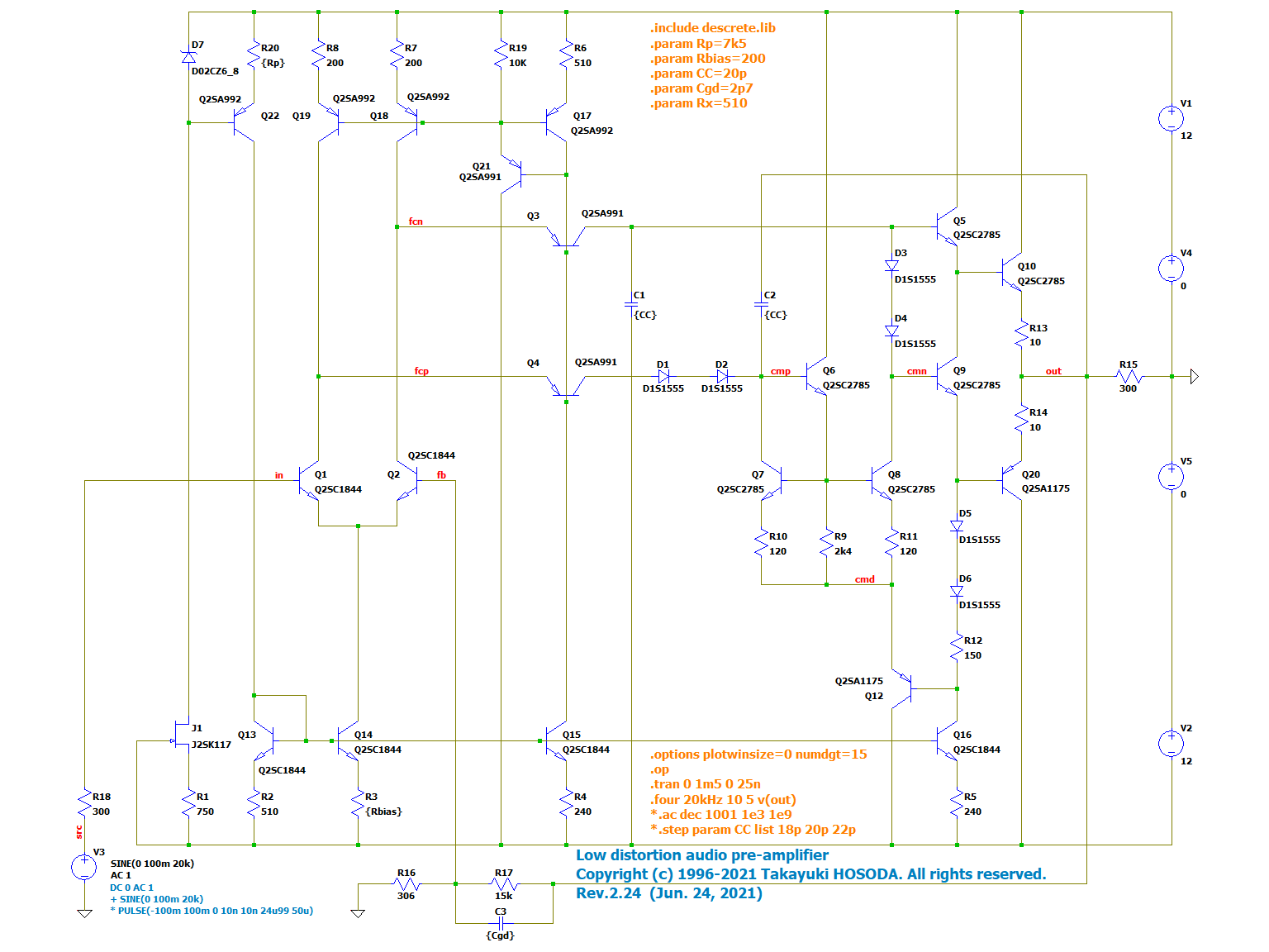 Rev.2.0 (Apr. 17, 1996) simulation by SPICE 2g6 Rev.2.1 (Jul. 25, 1996) rewritten for PSPICE — Schematic wallpaper (Low distortion pre-amplifier) Rev.2.2 (Jun. 19, 2021) rewritten for LTspice XVII Rev.2.22 (Jun. 22, 2022) bias opimization Rev.2.24 (Jun. 24, 2022) group delay opimization