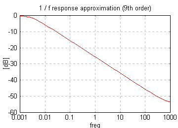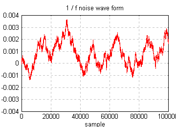 #include <stdio.h> #include <stdlib.h> #include <math.h> #define MAX_Z 16 double z[MAX_Z]; double k[MAX_Z]; double pinkfilter(double in) { extern double z[MAX_Z]; extern double k[MAX_Z]; static double t = 0.0; double q; int i; q = in; for (i = 0; i < MAX_Z; i++) { z[i] = (q * k[i] + z[i] * (1.0 - k[i])); q = (q + z[i]) * 0.5; } return (t = 0.75 * q + 0.25 * t); /* add 1st order LPF */ } void init_pink() { extern double z[MAX_Z]; extern double k[MAX_Z]; int i; for (i = 0; i < MAX_Z; i++) z[i] = 0; k[MAX_Z - 1] = 0.5; for (i = MAX_Z - 1; i > 0; i--) k[i - 1] = k[i] * 0.25; } int main() { int i, j; double n; init_pink(); srandomdev(); for (i = 0; i < 65536; i++) { printf("%.8g\n", pinkfilter(random() & 1 ? 1.0 : -1.0)); } }