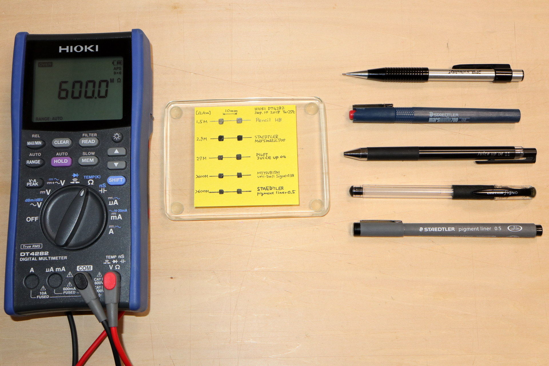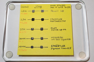 ということで、身近な筆記具で描いた線の導電性を2,3調べてみました。 比較用に鉛筆(HB)と製図用顔料インクで描いた線の導電性も調べています。