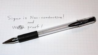 ゲルインクの Mitsubishi pencil, Uni-ball Signo ですが、ゲルが絶縁的に作用しているのか乾燥後にも絶縁性が維持されていました。